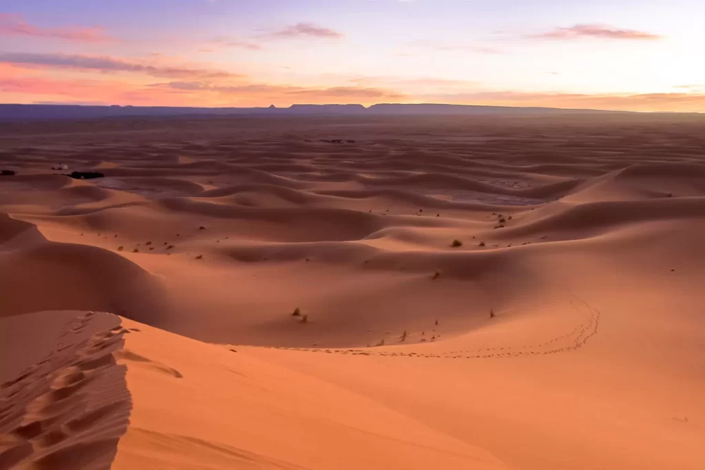 After sunrise over the dunes and a traditional nomad breakfast, depart for Marrakech along the track off-road between Erg Chigaga and Draa River to Lake Iriqui, then to the village of Foum Zguid. Stop for lunch at Taznakht, the capital of Berber carpets. Then we will keep driving to Marrakech over the High Atlas mountain pass of Tizi-n- Tichka. We will ariive to Marrakech late in the afternoon.