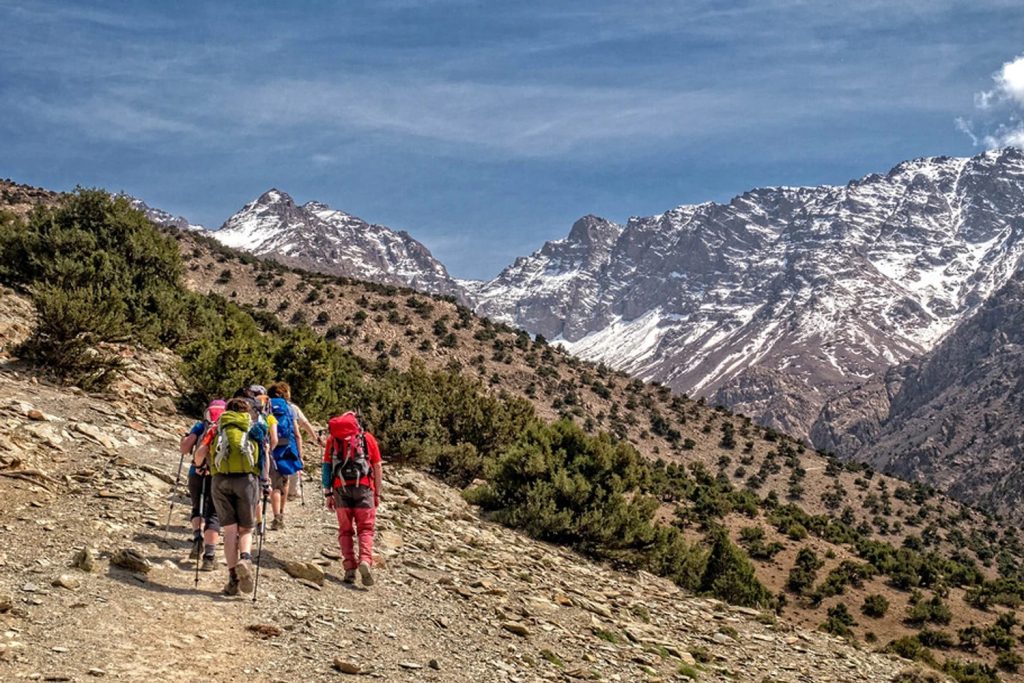 We leave Marrakech after breakfast and drive to Imlil via Asni. Imlil is the principal trailhead for Hikers, and a busy market town. There is a constant movement of people coming down from the mountains, and an equal supply of activity from those about to embark on their adventure. We meet our mule team and once all our gear is loaded we begin walking along the valley towards Tacheddirt, some 8kms beyond Imlil. Soon the trail begins to rise as we climb up to the pass at Tizi n’Tamatert (2,279m). We then descend to the pretty village of Ouaneskra and continue, for a further half-hour or so, to Tacheddirt (2,300m), where we generally camp near the river. Meals included: 1 breakfast, 1 lunch, 1 dinner.